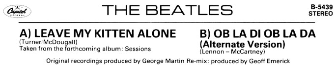 Here is the Capitol B-5439 unreleased picture sleeve for Leave My Kitten Alone, which first appeared in January 1985 in very limited quantities (collectors were originally told that only 10 of 85 total existing copies would be available). It was to be the first single from the aborted Sessions album. The sleeves were originally sold for prices above $600.00, until 1994 when 1500+ copies were "found", forcing the price below $100.00. Some suspect that the entire quantity of thousands existed initially, and the sleeves were slowly dispersed in order to keep the price and value/demand high, a not-uncommon practice in the bootleg & collectors world (similar to the Girl sleeve and the pirate Tollie EP). These limited sales went on with the Kitten sleeve for nine years before a large quantity was unleashed on the market. There has been some debate recently about the authenticity of the sleeve. Someone from Charlotte, North Carolina, has recently sent out letters to several Beatlefans stating that the sleeve is a fake, based on the fact that there are several errors and inconsistencies on the picture sleeve printing. It should be noted that several of the errors listed in the letter (reprinted below) appear on the original internal EMI label copy publishing sheets from England, which explains why some of the errors may have appeared on the Capitol sleeve. Last year, a major collection was sold that included released, unreleased, and alternate artwork from several Beatle albums and singles. The original Capitol and EMI slicks, proofs and artwork for the aborted Sessions album project were in the collection. The materials were obtained directly from Capitol Records in 1985 after the project was cancelled, and included was a U.K. picture sleeve example of Leave My Kitten Alone, very similar to the U.S. intended release. It's entirely feasible that the erroneous artwork was never intended to be printed. Our theory is that proofs were run in small numbers by Capitol (with errors), and an inside connection simply took the early artwork to the printer and ran off a few thousand copies, perhaps a deliberate overrun intended just for the collectors market. At $600-$700 each, the incentive would certainly have been there, as proven by the demand and value for the initial copies, and the mega-profits realized by so many "overruns" in the past. A similar story happened with the Capitol Girl sleeve (sans errors), only they were initially sold for far less. In 1977, four cases of Girl picture sleeves, 16,000 pieces, hit the collectors market when two dealers bought them all from a source at Capitol. They were offered for $40-$50.00 retail and $5-$20.00 wholesale, and slowly worked their way down to $8.00 and have since rebounded to around $20.00. Now twenty years later, they have just about all been sold. Over the past 25 years, hundreds of different records, sleeves and other products have come to the collectors market via Capitol in quantities beyond what might be normal or reasonable for a release (promos are a classic example). This pattern, along with other expert examination of the sleeve, liner notes, and history by several top collectors, leads us to conclude that at least some sleeves were no doubt printed by Capitol Records, and that the balance of them were printed either by them, a vendor, or someone close to or on the inside. More information and interesting facts will be forthcoming...Your comments are welcome. |