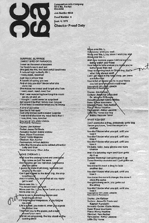 | John Lennon had originally planned to include the song Move Over Ms. L on his Walls and Bridges album, but decided at the last minute to leave it off. Below is an original "checker proof " sheet from the album artwork file showing the song "Move Over Ms. L" crossed off with the words "out". The proof is dated September 4, 1974 - Three weeks before the album was released. The song was to be placed between Surprise Surprise and What You Got. It was released six months later as the B side of the single Stand By Me (Apple 1881). |