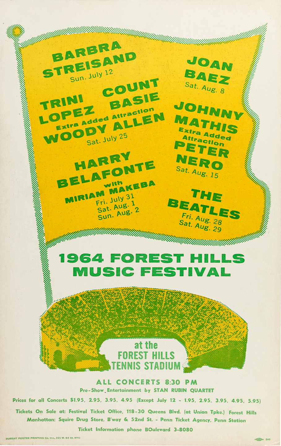 Starting at dawn, almost 2,000 squealing teen-age girls maintained an unrewarded vigil outside Delmonico's Hotel on Park Avenue at 59th Street. After most of the hotels didn't want to book The Beatles, Ed Sullivan intervened and was able to get The Beatles lodging. The police kept order outside the hotel and blocked the entrances to everyone under 20 years old. An additional hundred police manned the barricades between 59th and 60th street to keep the fans across the avenue from the hotel. Twelve private guards reinforced this prohibition inside. Teenagers stayed outside the hotel until 4:00 a.m. cheering anyone who opened a window, closed a window or went near a window. The teenage backlash to adult authority threatened twice to get out of control but swift decisive police action intervened. At 1:10 p.m. 40 girls rushed the revolving doors under the leopard-skin marquee. The Beatles high up on the 9th floor noticed none of this, as they didn't arise until 2:00 p.m. after retiring at 6:00 a.m. Breakfast consisted of corn flakes, orange juice and soft-boiled eggs served in their suite. Before departing the Delmonico Hotel the Beatles, at 5:30 p.m., held a press conference in the Crystal Ballroom and answered question for about 15 minutes after arriving 30 minutes late. "Their valet mislaid a pair of pants" was the explanation offered to about 250 "newspapermen" consisting largely of 15-year-old girls. The Beatles arrived at the stadium by helicopter, but their concert on the 28th was delayed because the helicopter and pilot left without permission. About 300 police were stationed inside the Queens stadium and 200 members of Burn's security patrolled outside. Four ambulances were set up to dampen any hysterical outbursts from the sold out crowd of 16,000. The Beatles appeared on stage at 9:50pm, two hours after the fans had filled the outdoor stadium to over-capacity and the screams were ear splitting and continued throughout the half-hour performance. The Beatles' performance on this date is famous not for what happened during the show but what transpired afterwards. It was after this performance that The Beatles were introduced to Bob Dylan who proceeded to get them very stoned... Forest Hills and the Hollywood Bowl 1965 were the only two times the Beatles played two concerts spread over two days. Most doubles were done in an afternoon and evening format during the same day. |