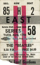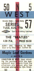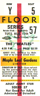 Toronto shares an interesting bit of history with four other venues in being the only places the Beatles performed on each of the three U.S. tours. The other venues were Los Angeles, which included two Hollywood Bowl shows and one Dodger Stadium show, San Francisco which featured two shows at the Cow Palace plus the historic final show at Candlestick Park, Chicago at the International Amphitheatre in '64 & '66 and White Sox Park in 1965, and New York, which had the most appearances by far - Forest Hills and the Paramount Theater in 1964, Ed Sullivan Theater and Shea in 1965, and Shea again in 1966. The Beatles appeared two more times in New York in February of 1964, at the Washington Coliseum and Carnegie Hall for a total of 7 New York appearances (11 shows). All unused Maple Leaf Gardens tickets have a torn perforation (usually clean) at the bottom, with the 3rd section remaining in the ticket log. The 2nd perforation was torn upon admittance, thus voiding the ticket. |