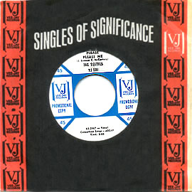 | This is the title sleeve that was issued with promotional copies of the VJ-581 single Please Please Me / From Me To You. It is one of the rarest of all Beatle sleeves and is currently valued at $2,500 in near mint condition. The promotional disc, shown below left, is also very scarce in high-grade condition and near mint copies sell for around $400.00. Below right is the stock picture sleeve. |
