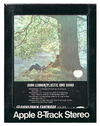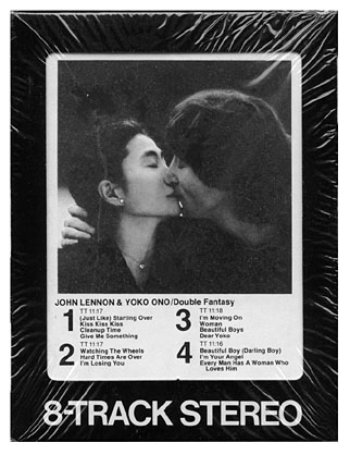 The 1/4 inch tape was housed in a plastic cartridge, running in an endless loop at 3¾ inches per second. The pinch roller was built in to the cartridge, and cheap manufacturing led to the use of plastic rollers instead of rubber, which caused excessive tape wear and jamming. The tape is divided in along its length into 8 channels (tracks)- allowing 4 "channels" of stereo music. Most major companies quit producing 8-tracks by 1988. It's hard to believe, but several smaller companies still release titles on this format today! Now, in the late 1990s, the popularity of collecting 8-track tapes is noticeably on the rise. It wasn't too many years ago that most collectors would pass these by at conventions and on lists, figuring them as pretty much worthless. Just try to find ANY Beatles title of a 1960s 8-track tape that is still sealed - you'll find many titles harder to find and perhaps rarer than their sealed vinyl counterparts. Even sealed, they hardly exist in mint condition, as many had "bubbled" labels and bent outer cardboard sleeves. Solo Beatles titles are more common, but it can still be difficult to find unopened copies of many titles. The first Solo Beatles 8-track tape issued was John & Yoko's Two Virgins at the end of 1968, and the last was George's Cloud Nine in 1987. | |||||