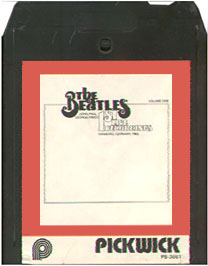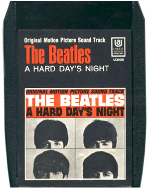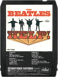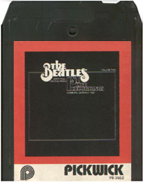 The 8-track cartridge format originated in the mid 1960s and, amazingly, survived more than twenty years. It was the preeminent portable and car audio format of the late 1960s and 1970s. In September of 1965, Ford offered a factory installed in-dash player for all their new 1966 models, which helped increase the popularity of the format. In the 1967 model year, Chrysler and GM offered optional 8-track players. The 1/4 inch tape was housed in a plastic cartridge, running in an endless loop at 3¾ inches per second. The pinch roller was built in to the cartridge, and cheap manufacturing led to the use of plastic rollers instead of rubber, which caused excessive tape wear and jamming. The tape is divided in along its length into 8 channels (tracks) - allowing 4 "channels" of stereo music. Most major companies quit producing 8-tracks by 1988. Several smaller companies continued to release titles into the 1990s. In the late 1990s, the popularity of collecting 8-track tapes became more popular. Prior to that time, most collectors would pass these by at conventions and on sales lists, figuring them to be pretty much worthless. Trying to find Beatles titles of the 1960s 8-track tapes that are still sealed has become more difficult over the years. Even sealed, they hardly exist in mint condition, as many that turn up have "bubbled" labels and bent outer cardboard sleeves. The very first Beatles 8-track tape issued was Rubber Soul, at the end of 1965, and the last was Reel Music in 1982. The last Beatles-related 8-track issued was George Harrion's Cloud Nine which was released via record club only in 1987. The ONLY promotional Beatles 8-track ever issued was Live At The Hollywood Bowl, designed for in-store promotional use.