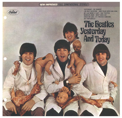 Shown here, for the first time ever, is a Sales Presenter copy of the Butcher cover sleeve. It is similiar to, but trimmed larger than the LP sleeve in order to punch the holes for inclusion in the Sales Presenter.