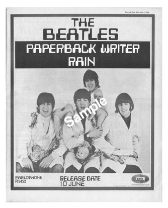 First printed publication of the Butcher cover photo, B&W full-page EMI advertisement for the Paperback Writer single, June 3, 1966 cover date. Value is for the entire issue. Ad by itself is worth 50% of full issue price. |