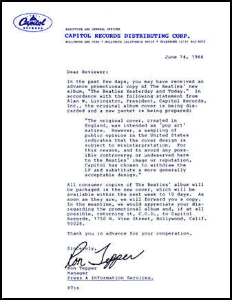 "Customer response letter" from Capitol Records (as above, originals are very hard to find but are easily identified by the Capitol watermarks in the stationary used and the grey Capitol logo on the letterhead. These letters were used by Capitol to personally answer complaints they received regarding the Butcher cover. An original copy of this letter was recently discovered and sold for $2500.00. The letter was not known to exist until 1996) |