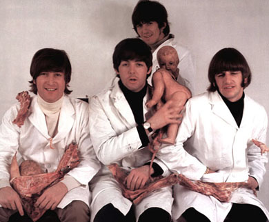 | This pose is very similiar to the final version, but missing the doll between John and Paul's shoulder and the doll head in Paul's lap. All of their facial expressions are also slightly different.This is one of the few alternate poses of which a high quality copy has surfaced. |