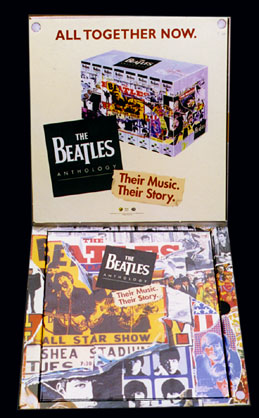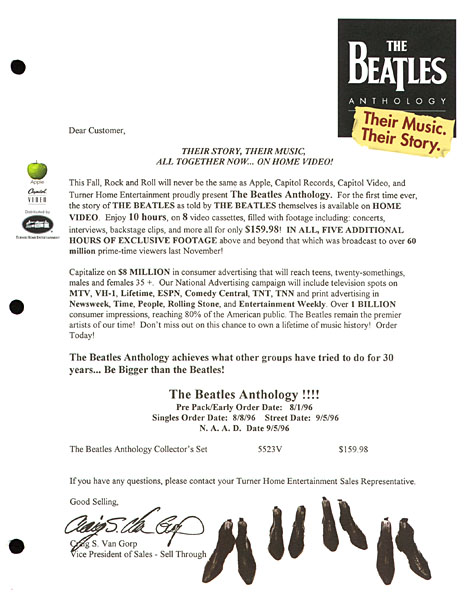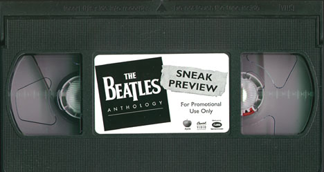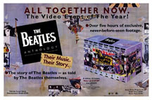 The first trade ad announcing The Beatles Antholgy ten-hour video release premiered in the July 7, 1996 issue of Video Store magazine. The VHS set included 8 seventy-five minute videotapes and was released on September 5th with a retail price of $159.98. Retail selling prices have ranged from $89.00 to the full list price. In early 1997, warehouse club Costco was selling the set for only $79.00.