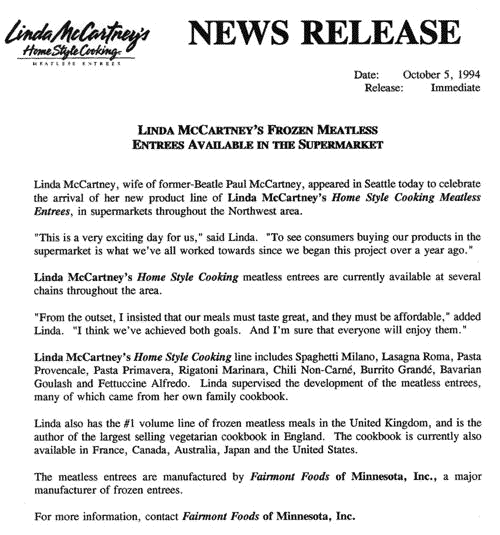 | Seattle press release for Linda’s frozen Meatless Entrees |
