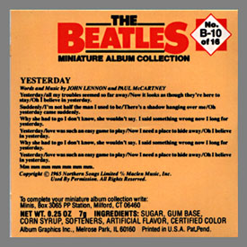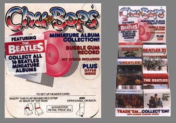 | The Beatles Chu-Bops Bubble Gum Records series was manufactured by Album Graphics, Inc. of Illinois, and was sold in stores during the 1980's. Shown above is the header card and the display box which held 64 pieces - 4 each of 16 different Beatles album titles. Each piece was sold at a suggested retail price of 35 cents. Sets of the 16 "albums" are worth $40-$60 while a display box complete with the 64 pieces sells for $150 to $200. A sealed master carton containing 6 of the 64 piece display sets was sold in January 1998 for $1,000.00. |