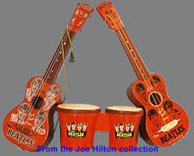 Other memorabilia instruments issued in the 60's were a banjo, several different drum sets, drumsticks, harmonicas, a hummer, and even guitar strings. We may feature some of these items in the future...Below is a list of the known original guitars issued in the U.S. and the U.K. Scans will be added as we get them.