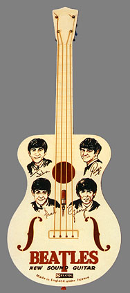| Selcol (UK) | "New Beat Guitar" | 32-1/2" red and bergundy 4-string plastic, color Beatles picture and autographs on front, issued in coffin-shaped cardboard box. | $550 (deduct $200 if sticker missing) | $750 |