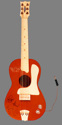 | Selcol UK) | "Beatles Red Jet Electric" | 31" red and white six-string electric guitar with Beatles sticker and autographs on front, issued in coffin-shaped cardboard box. | $1200 (box, deduct $400 if sticker missing) | $2500 (w/ "wah-wah" arm - w/o arm $2000) |