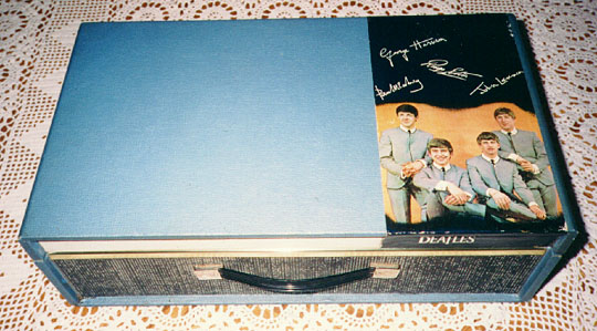 This is considered by most collectors to be one of the ultimate pieces to own of all commercial Beatles memorabilia. The 4-speed 17-1/2" x 10" x 6" NEMS record player was manufactered in 1964 and only 5000 were made, with very few surviving. So far, only a few near mint units have turned up - the majority that have surfaced are in worn condition. The colorful 20" x 11" x 7" packing box is even rarer, only a handfull are known to exist. An owners manual was also included. The serial numbers were on a piece of paper attached to the inside lid, and in most cases this is missing. The value has at least doubled in the last three years for upper condition players, selling just a few years ago for $1500 to $2000 and now in 2001 for $4000 and up, when they can be found. |