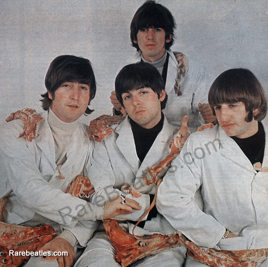 BUT WHAT'S THIS? The Beatles as butchers draped with raw meat! Disc and Music