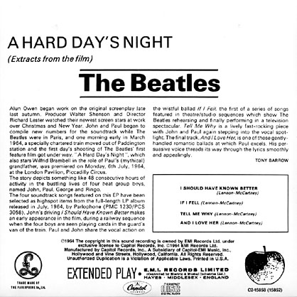 ![]() | A Hard Day's Night (Extracts From The Film) | CD-15858 | I Sould Have Known Better / If I Fell Tell Me Why / And I Love her |