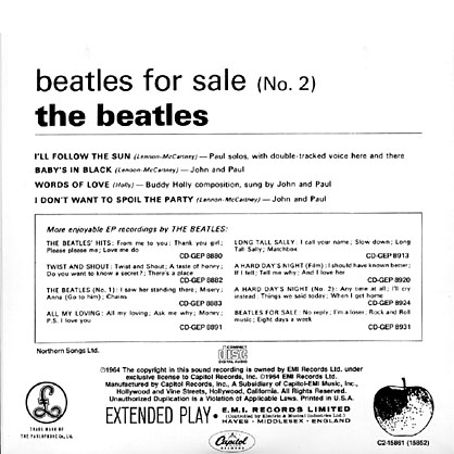 ![]() | Beatles For Sale No. 2 | CD-15861 | I'll Follow The Sun / Baby's In Black Words of Love / I Don't Want To Spoil The Party |