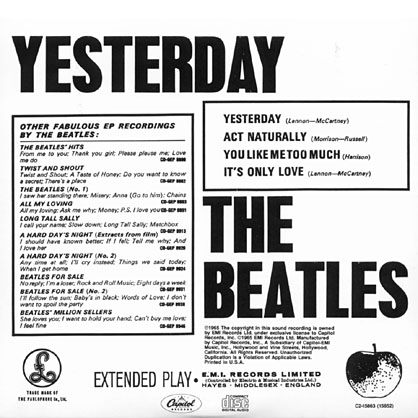 ![]() | Yesterday | CD-15863 | Yesterday / Act Naturally You Like Me Too Much / It's Only Love |