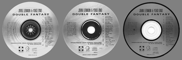 In the U.S., there were originally three different versions of Double Fantasy released on compact disc, as shown in the chart below. The first listing is the rarest issue, and so far only a couple of known copies of this version have been documented...the variation found most often is the common German-pressed release, followed by the Columbia Record Club version