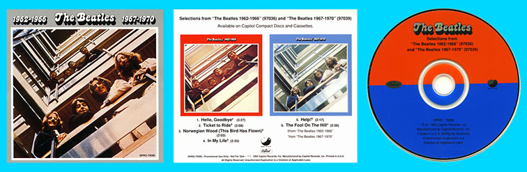 | The second of the two different promotional issues, this CD featured 6 selections from the "red" and "blue" albums. The tracks were Hello Goodbye, Ticket To Ride, Norwegian Wood, In My Life, Help! and The Fool On The Hill. |