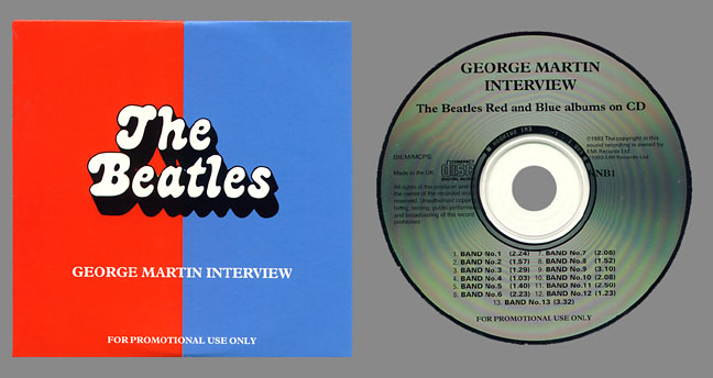 | This promotional-only George Martin interview CD was issued in 1993 by EMI to promote The Beatles "Red" (1962-1966) and "Blue" (1967-1970) albums that were being released on CD. Included with the promo CD was an 18-page question and answer text of the entire 13-track interview. The interviewer was Mark Lewisohn. Copies are getting harder to find, and currently sell for around $50-$70.00. |