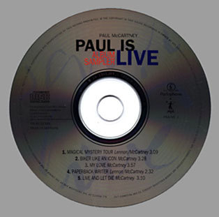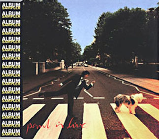 This 5-track album sampler CD was issued in Europe and immediately withdrawn, in part because of the error on the front cover artwork. The background was the '93 version instead of the '69 version, (which appeared correctly on the commercial album and CD releases). Notice also the yellow and red tints in the lower right corner. The live tracks included were Magical Mystery Tour, Biker Like An Icon, My Love, Paperback Writer, and Live and Let Die. A mint copy of the withdrawn version goes for over $100.00.
