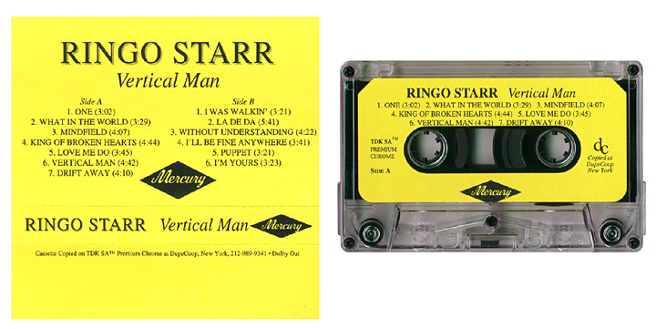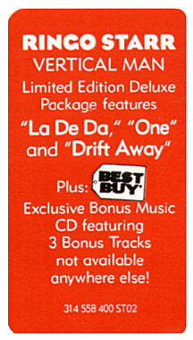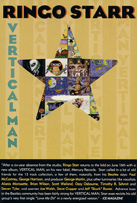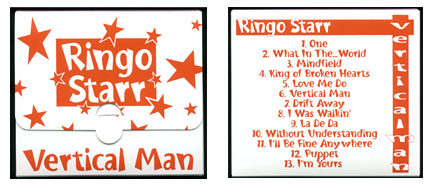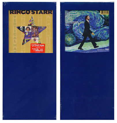 The following is a list of all known issues, variations and support materials for the U.S. release of Ringo Starr's new Vertical Man album, as well as some non-U.S. releases. Numbers given for quantities are estimates based on information from industry and collecting sources. Due in part to the intense advertising and promotional campaign, there are plenty of variations for collectors to gather, the most ever for a Ringo album.