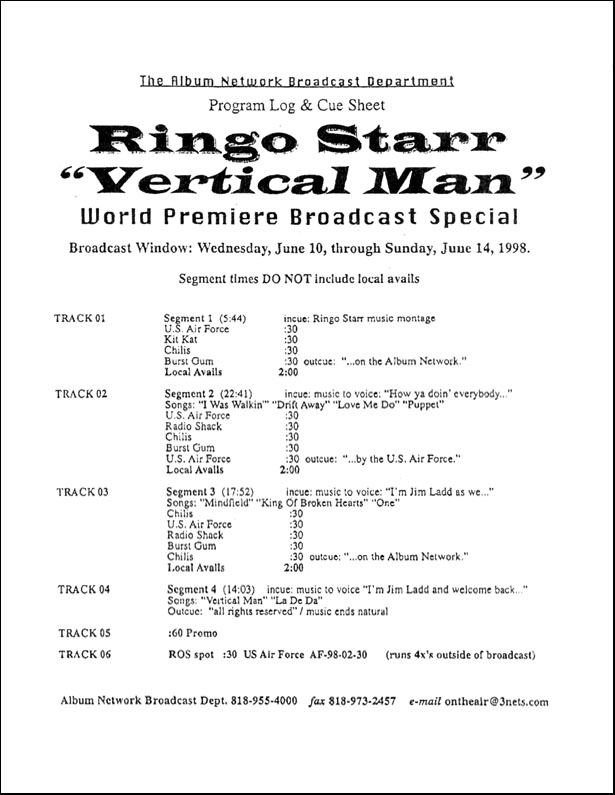 (no #) | The Album Network Presents Vertical Man | World Premier broadcast CD (hosted by Los Angeles DJ Jim Ladd, for one-time broadcast June 10-14th, 1998. Contained 9 songs- I Was Walkin, Love Me Do, Drift Away, Puppet, Mindfield, King of Broken Hearts, One, Vertical Man and La De Da. No cover, sent to radio stations in jewel case with program log and cue sheet.) |