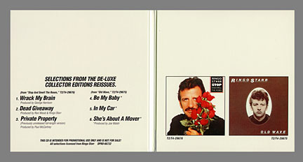 | Capitol Records issued this promotional CD in 1994 to promote their De-luxe Collector Edition Reissue series LPs Old Wave and Stop and Smell The Roses. The CD contained three tracks from each album - Wrack My Brain, Dead Giveaway, and Private Property from Roses, and Be My Baby, In My Car, and She's About A Mover from Old Wave. Shown above is the CD and the front & back covers, below is the inside of the gatefold sleeve. A small number of these CDs were pressed, making it very difficult to find. It usually sells for $75 - $100.00. |