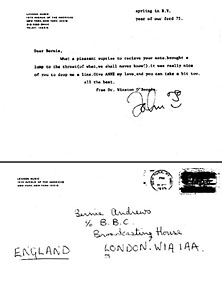 Copy of a letter and envelope written by John Lennon to Bernie Andrews of the BBC, April 1975.