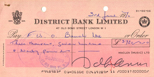 A Check signed by John Lennon dated June 3rd, 1970.
