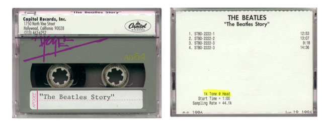 | The Beatles' Story Digital Audio Tape (DAT) master. This album has never been released on any tape format. In 1996 Capitol had planned to release this album commercially as a pre-recorded DAT tape, audio cassette and possibly CD. Perhaps because of the limited market for commercial DAT albums, and/or because they were concerned about releasing a high quality digital copy in the marketplace, the project was scrapped. The DAT was mastered from the original The Beatles' Story master tapes. A promotional audio cassette was also made but not distributed. |