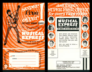 This is a rare 1960s promotional card offering a free issue of Britains New Musical Express weekly newspaper, "The World's Top Selling Music Paper". The bottom half was a perforated post-free reply card to be mailed in to get the free issue. The back featured pictures of Paul McCartney, Peter Noone, Elvis, Mick Jagger, Roger Daltrey and others. This was the same newspaper that premiered the Butcher cover photo on June 3, 1966. Click on card to enlarge.