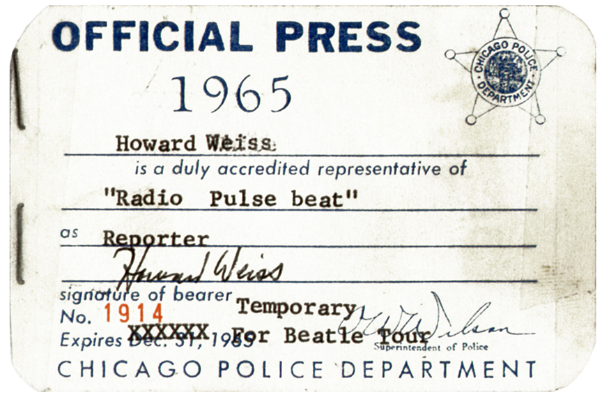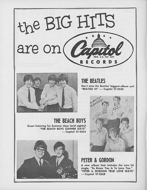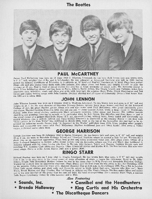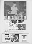 | This Chicago concert program book from 1965 featured 3 pages on the Beatles. From left to right, program front cover, a Beatles biography page, a full-page ad from Capitol Records and a 3/4 page ad from Ludwig. Click on any image for enlargement. |