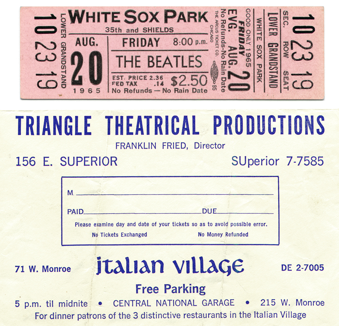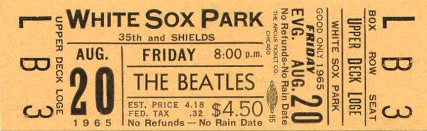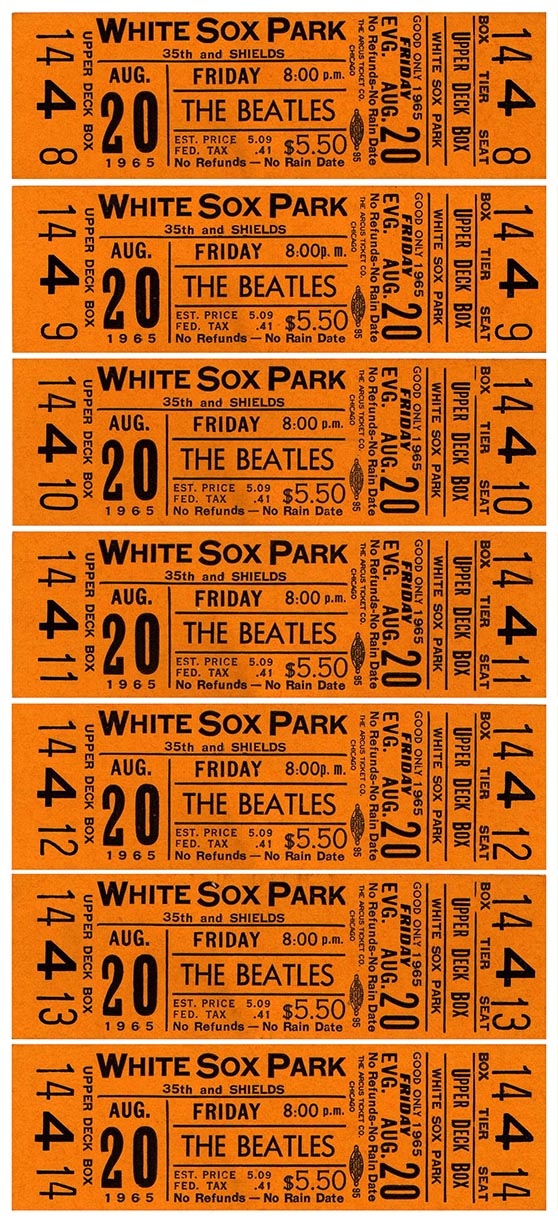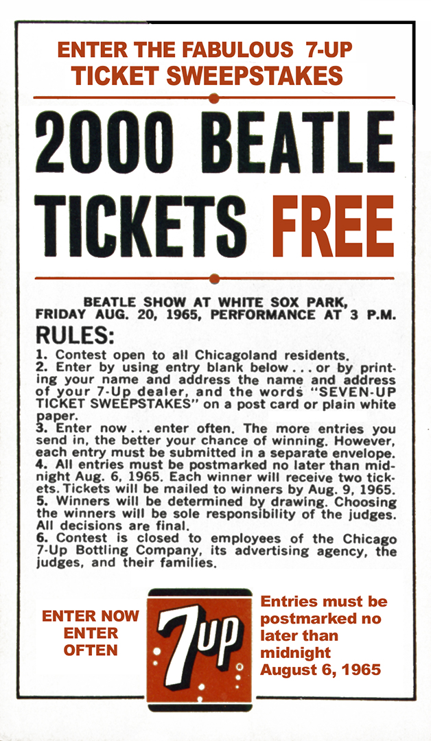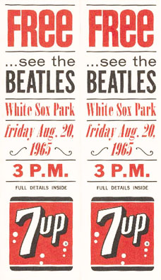 | 1965 contest insert and advertisement from 7-UP that was placed in bottle cartons offering tickets to see the Beatles at White Sox Park. Click to enlarge. |