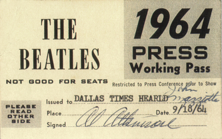 | 1964 "Press Working Pass", used for all shows on the 1964 tour. This example was was assigned to the Dallas Times Herald. 1964 Working Press Passes have been discovered in both used and unused form. All known used passes were given to Dallas-area fan club and press personnel. Despite the generic title of the pass, it is unknown whether the passes were issued by Feld Brothers for Dallas only, for both of their events, or whether the pass was issued to all travelling press. |