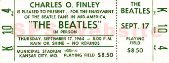 Kansas City was not originally on the schedule for this tour. Mr. Finley, being the prominant and rich owner of the Kansas City Athletics (which he later moved to Oakland), promised his community he'd get the Beatles to perform in his town. So he arranged contact with Brian Epstein shortly before the 17th of Sept. (one of the few days off that the Beatles had on their tour itinerary) and made them "an offer they couldn't refuse". Brian, being the thoughtful manager he was, left the decision to perform or not (regardless of the money) entirely up to the boys. When he posed the question, while holding the phone, they were only half paying attention while playing cards and John quipped quickly back to Eppy "We'll do whatever you want Brian!". Mr. Finley was able to keep his promise and pull off what no one else could ever do during that period - actually talk the Beatles into giving up a day off which they valued so much. Incidently, this "offer they couldn't refuse" was directly responsible for the high ticket prices and reportedly when they didn't all sell at that price right away, he printed up the $2 tickets to help recover his money! The Beatles came to town at 2:00 a.m. in pelting rain with only about 100 people there to greet them. They departed the airplane and descended down the steps-George, Paul, Ringo then John, and into a waiting limousine and whisked them to the Muehlebach Towers. The Beatles stayed on the 18th floor suite, called the Mecca and settled in sometime around 2:45 a.m. Seven bellman wrestled 200 pieces of luggage and room service was ready for their order. Ringo went first and ordered three buckwheat cakes and tea while the others had two orders of bacon and eggs and one grilled cheese sandwich. Additional orders included four orders of coffee, a plate of slice tomatoes, two glasses of milk and a pitcher of orange juice. The Beatles started their usually card game surrounded by more food that was already in the room. A Missouri country ham, apple cider, a mincemeat pie and a watermelon. The night and games dragged on and by 4:30 a.m. more coffee and toast was needed. The song "Kansas City/Hey, Hey, Hey" was added to the standard 12-song setlist. Gate receipts reportedly totaled $150,000, with the Beatles share working out to $4,838 per minute. At that time, it was the highest fee ever paid to a performer for a single performance. Municipal Stadium was demolished in 1976. The Beatles took the stage at 8:44 p.m., brought on by the announcer's simple, "THE BEATLES" and 20,214 joined in a concerted scream as hundreds of flashbulbs lit the park like harsh fireflies. A line of 10 policeman lined the stage and 350 more patrolled the grounds and parking lot. The Beatles opened the show with the song Kansas City/Hey,Hey,Hey,Hey. The show had to be stopped when hundreds of fans rushed the stage. Beatles publicist Derek Taylor asked the crowd to settle down, or the police would have to cancel the show. The Beatles left the stadium at 9:15 p.m. and headed for the airport. The rumpled bed linen used by The Beatles during their one day stay in Kansas City-16 sheets and 8 pillow cases-sold for $750.00. Officials of the Hotel Muehlebach confirmed the transaction between the hotel and a man named Lawrence Einhorn of Chicago. Two businessmen took the sheets The Beatles used during their stay at the hotel, and cut them up into one-inch squares and sold them for $1.00 apiece. They sold them all, netting $159,000. |