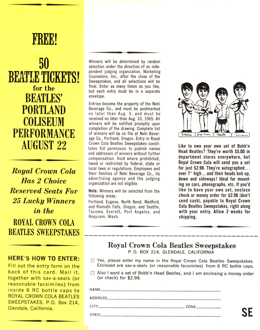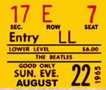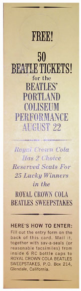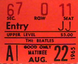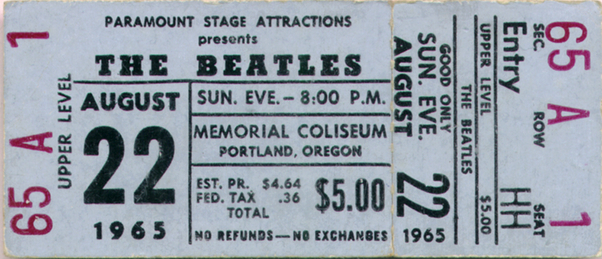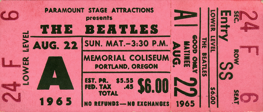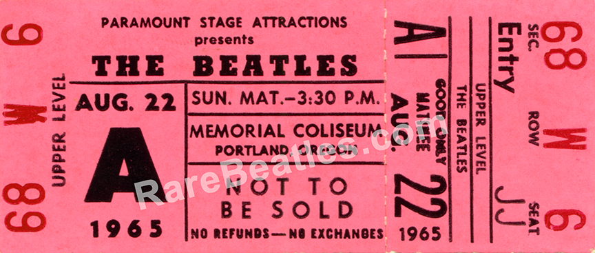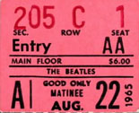 | Ten tickets to the Beatles Portland show were given away in a contest sponsored by a Southgate Drug store that was located more than 200 miles away, in Washington State. The ten lucky winners were announced in the local newspaper. The winner of the above ticket, an 11 year old fan, lived too far away to be convenient to attend the show and ended up not being able to go. He has kept the ticket perfectly stored in the original envelope for the past 35 years. |