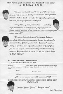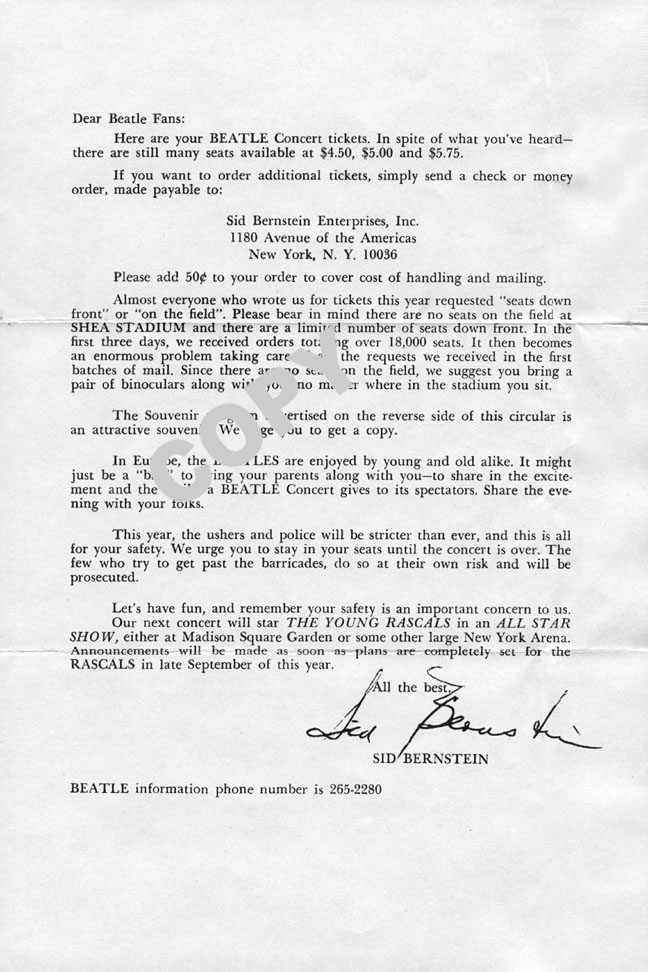 A two-sided letter sent out with orders of Beatle tickets for the Shea concert. The front is a "Special Offer" for "The Official Beatles Autographed Picture Book and Official Program", and the back is a letter from Sid Bernstein telling about the concert and how to order additional tickets. A similar flyer was also sent out in 1966. Both letters are extremely rare. |