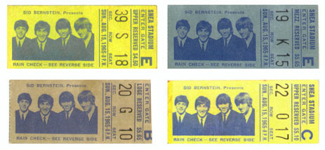 A new world record for a pop concert was created when more than 55,000 fans attended this legendary outdoor concert at Shea Stadium, and the Beatles also set a world record with their $160,000 share of the $304,000 gross receipts. The show was filmed by Ed Sullivan Productions for a 50 minute TV special that the BBC first aired on March 1, 1966. Very few unused 1965 Shea tickets have turned up over the years. The blue Mezzanine Box, Upper Box and Loge Box unused tickets are especially scarce. |
