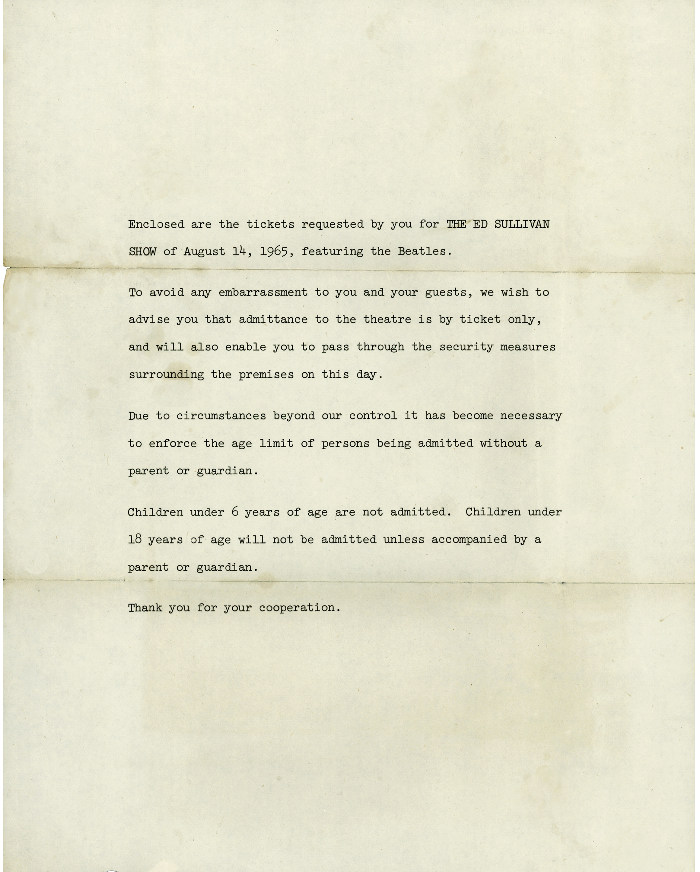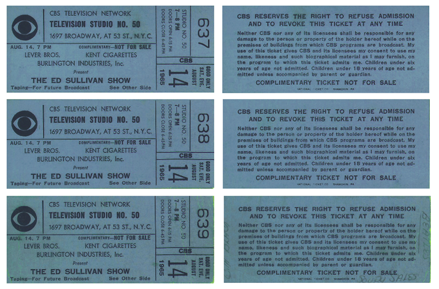 | The August 14, 1965 shows were the last of the performances by the Beatles in person on the Ed Sullivan show. The songs performed were I'm Down, Ticket To Ride, I Feel Fine, Yesterday, Act Naturally and Help. Both the dress rehearsal and the taping were performed before a capacity live audience of only 728 people. The show was not broadcast live, but transmitted a month later for the season premier of the Ed Sullivan Show on September 12th, 1965. Other acts performing were Cilla Black, Soupy Sales, Allen & Rossi and Fantasio the Magician. |