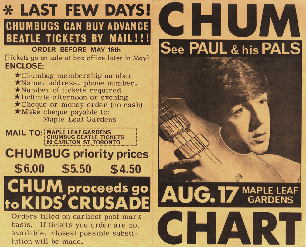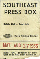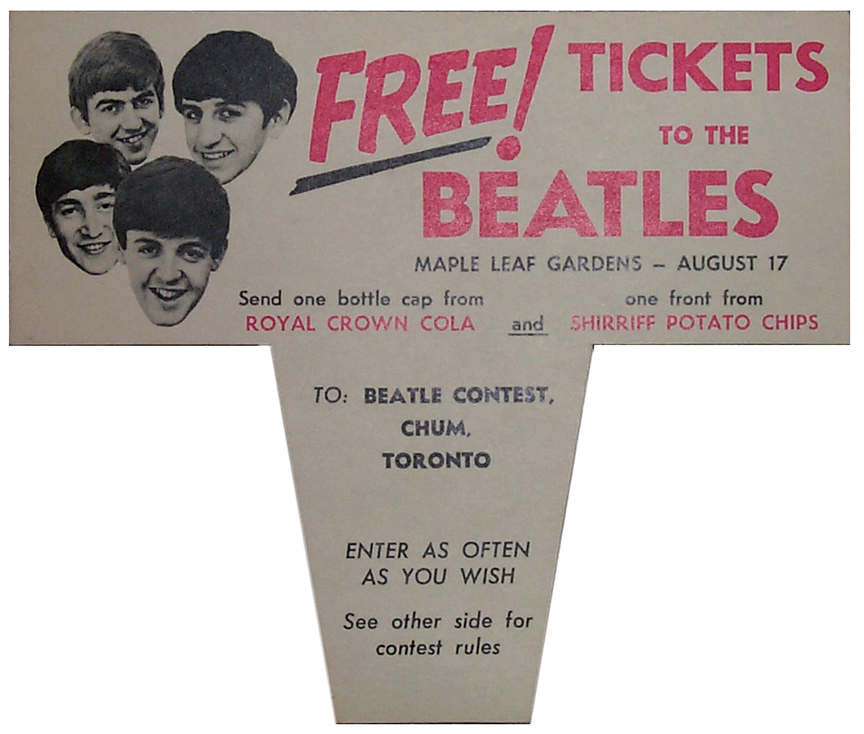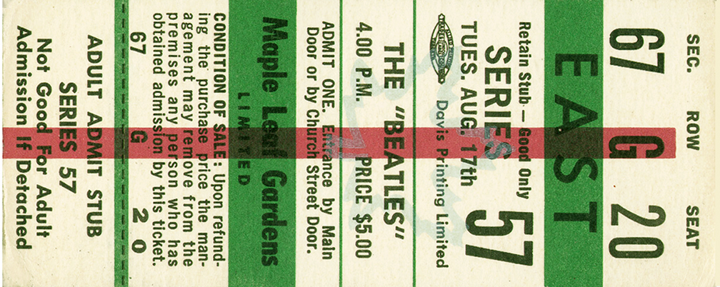 Toronto shares an interesting bit of history with four other venues in being the only places the Beatles performed on each of the three U.S. tours. The other venues were Los Angeles, which included two Hollywood Bowl shows and one Dodger Stadium show, San Francisco which featured two shows at the Cow Palace plus the historic final show at Candlestick Park, Chicago at the International Amphitheatre in '64 & '66 and White Sox Park in 1965, and New York, which had the most appearances by far - Forest Hills and the Paramount Theater in 1964, Ed Sullivan Theater and Shea in 1965, and Shea again in 1966. The Beatles appeared two more times in New York in February of 1964, at the Washington Coliseum and Carnegie Hall for a total of 7 New York appearances (11 shows). All unused Maple Leaf Gardens tickets have a torn perforation (usually clean) at the bottom, with the 3rd section remaining in the ticket log. The 2nd perforation was torn upon admittance, thus voiding the ticket. |