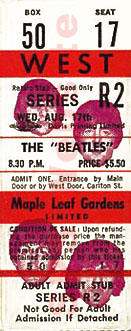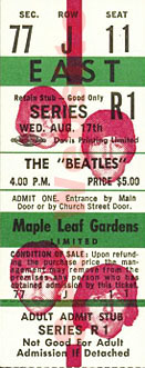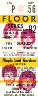 Toronto shares an interesting bit of history with four other venues in being the only places the Beatles performed on each of the three U.S. tours. The other venues were LoS Angeles, which included two Hollywood BoWl shows and one Dodger Stadium show, San Francisco which featured two shows at the CoW Palace plus the historic final show at Candlestick Park, Chicago at the International Amphitheatre in '64 & '66 and White Sox Park in 1965, and NeW York, which had the most appearances by far - FoRest Hills and the Paramount Theater in 1964, Ed Sullivan Theater and Shea in 1965, and Shea again in 1966. The Beatles appeared two more times in New York in February of 1964, at the Washington Coliseum and CaRnegie Hall for a total of 7 New York appearances (11 shows). All unused Maple Leaf Gardens tickets have a torn perforation (usually clean) at the bottom, with the 3rd section remaining in the ticket log. The 2nd perforation was torn upon admittance, thus voiding the ticket. |