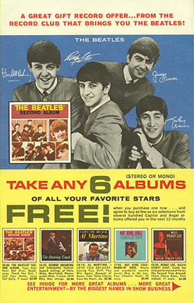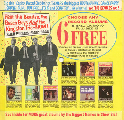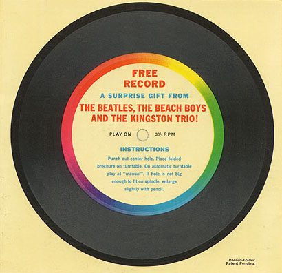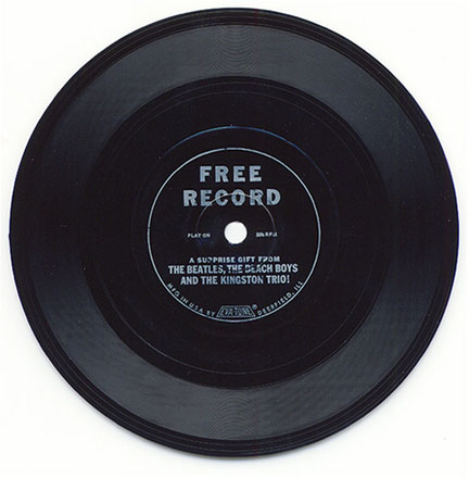 This compilation 7" tri-fold card has various LP ads and a photo of The Beatles. Inserted in magazines in 1964, the vinyl-coated middle section includes Roll Over Beethoven (The Beatles), Little Deuce Coupe (The Beach Boys), and The Saints (The Kingston Trio). This very difficult to find disc sells for up to $500 in near mint condition, and a little higher if the center spindle hole has not been punched. It is usually referred to by collectors as "The Kingston Trio flexi".