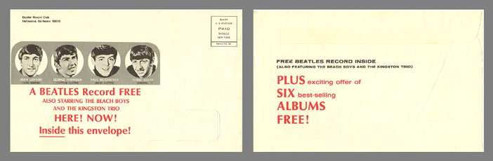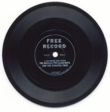 The same 3 songs were also released in a 5" round version flexi-disc with black vinyl and white print. NM copies of this version are in the $300 range. But of far greater value is the envelope that the latter was issued in. Designed as a mailer-sleeve, size 9-1/2" x 6", it featured black and red lettering along with a black and white photo of each Beatle. On the front it says "A BEATLES RECORD FREE" and on the back "FREE BEATLES RECORD INSIDE". Only one known copy has been documented, making it one of the rarest of all Beatles sleeves.