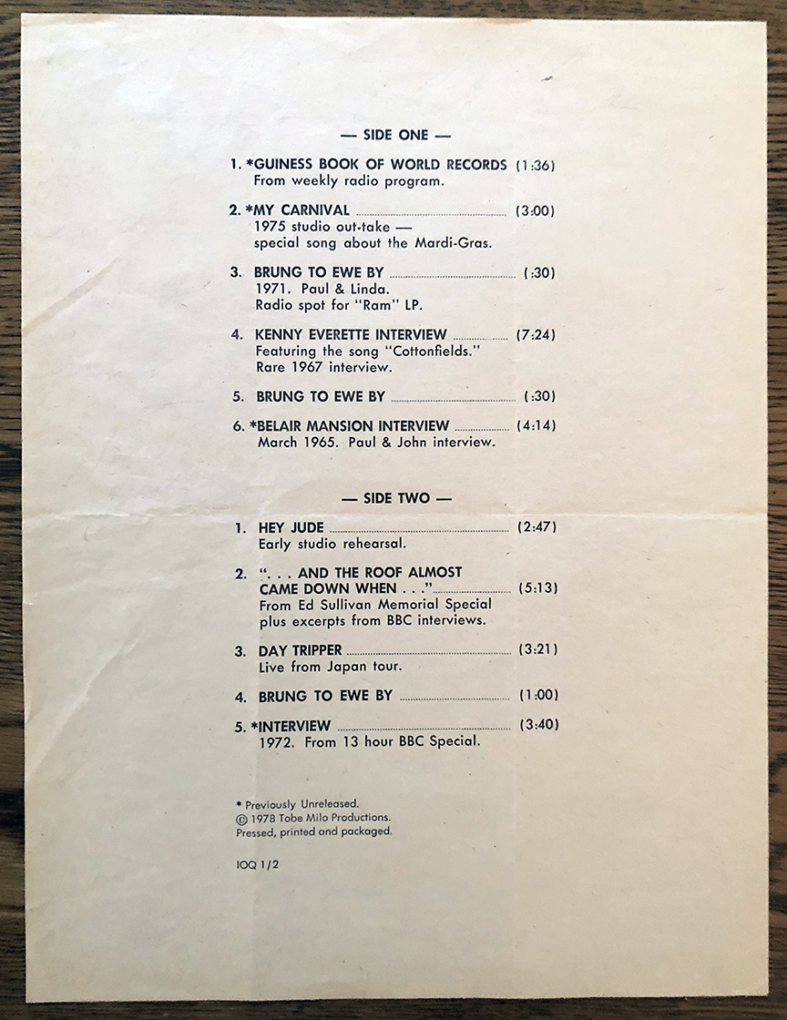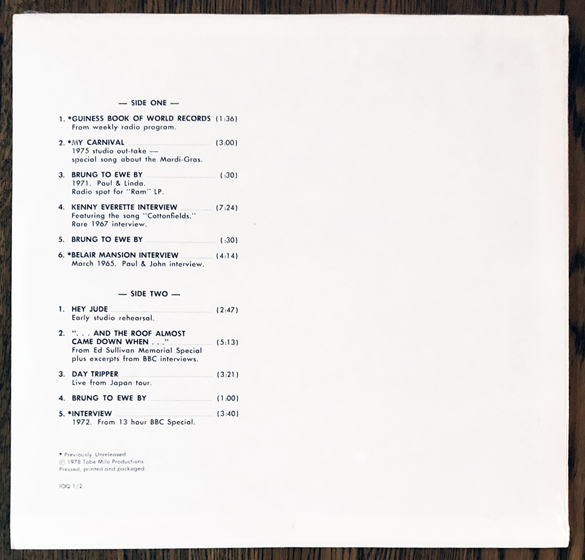 Side 1: Soundtrack from Man Of The Decade (U.K. TV special first aired 12-31-69) 2. "Studio Toga" (consisting of several excerpts from a January 1969 performance of Three Cool Cats, Blowin' In The Wind, Lucille, I'm So Tired, Ob-La-Di, Ob-La-Da, 3rd Man Theme, "Negro In Reserve", Don't Let Me Down, and One After 909.)