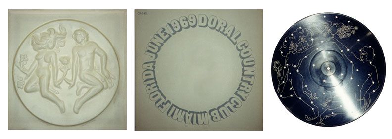 | This vacuum-formed plastic mold of a custom version of John and Yoko's Two Virgins album was made for and distributed to employees at a Capitol Records June 1969 sales meeting. The meeting was held at the Doral Country Club, a golf course in Miami. The copy shown here belonged to John Grimes, who worked at Capitol's distribution division from 1964-1971. Shown above left is the 3/4"-thick molded front cover, the cardboard back of the jacket, and the simulated picture disc LP with drawings of John and Yoko. The disc had no grooves. Click on photo to enlarge. |