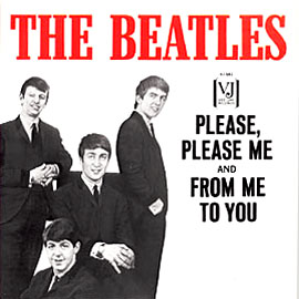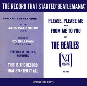 | This is the title sleeve that was issued with promotional copies of the VJ-581 single Please Please Me / From Me To You. It is one of the rarest of all Beatle sleeves and is currently valued at $2,500 in near mint condition. The promotional disc, shown below left, is also very scarce in high-grade condition and near mint copies sell for around $400.00. Below right is the stock picture sleeve. |