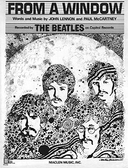 This rare piece of "Beatles" sheet music, an error by Maclen Music (the publisher), turned up at a California music store in the late 1980s. In all, 5 copies were found, and so far no others have ever turned up, making this the rarest of all Beatles sheet music issues. This sheet music title was originally issued in 1964 correctly listing Billy J. Kramer as the recording artist, and with his photo. When Maclen Music started re-issuing sheet music in 1968, they somehow inadvertantly printed From A Window listing it as "Recorded by the Beatles on Capitol Records" and placed a Beatles drawing on the cover.
