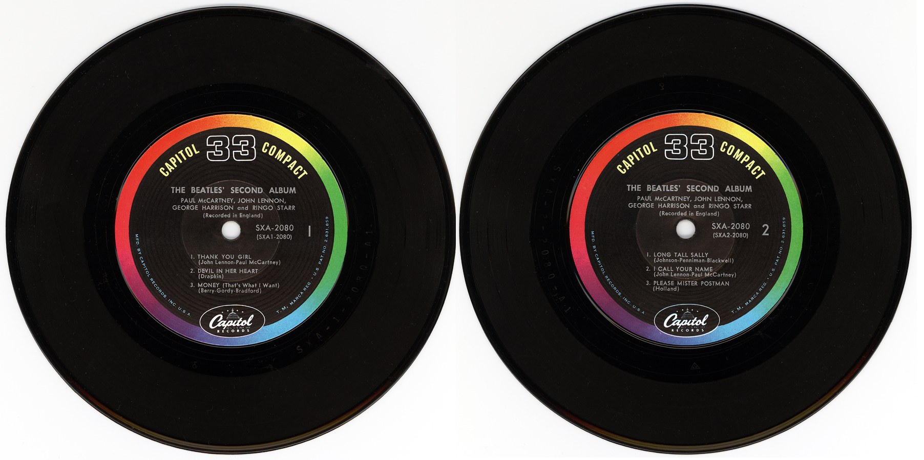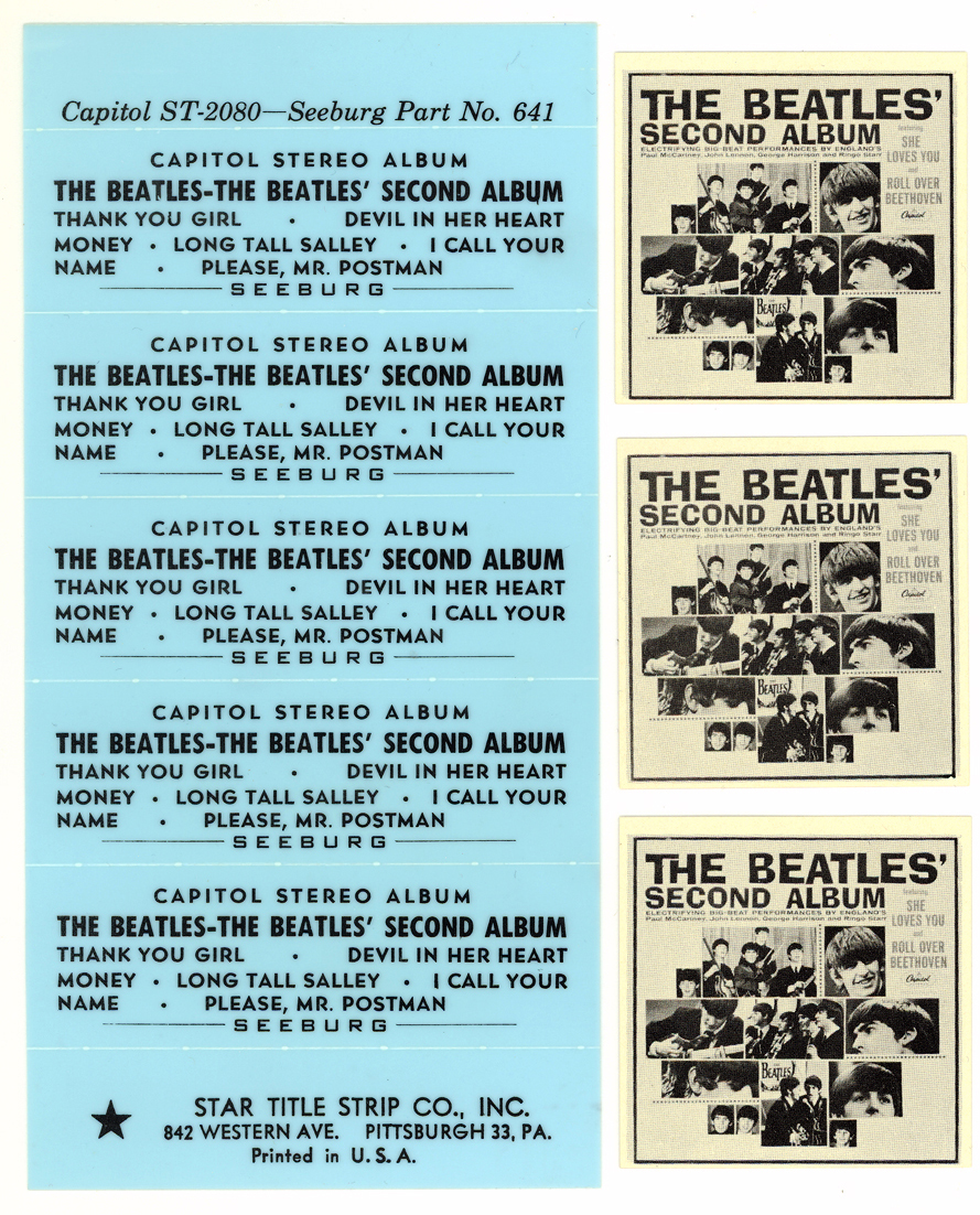 | Capitol | SXA-2080 | Beatles Second Album Compact 33 (Issued for use in jukeboxes, contains 6 tracks from the LP, hardcover jacket with blank back. Originally issued with five connected Seeburg 3" x 1" Jukebox blue title plastic strips and three 1-7/8" x 1-7/8" mini lp cover paper inserts, both manufactured by the Star Title Strip Co.) | 1964 | $1,200.00 | |